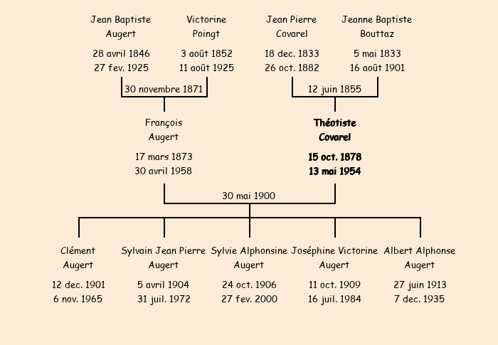 Epoux : François Augert (27 ans, né le 17 mars1873 au Chef Lieu, cultivateur au Chef Lieu, a signé), fils de Jean Baptiste (cultivateur au Chef Lieu, a signé) et de Victorine Poingt (cultivatrice, a signé) |