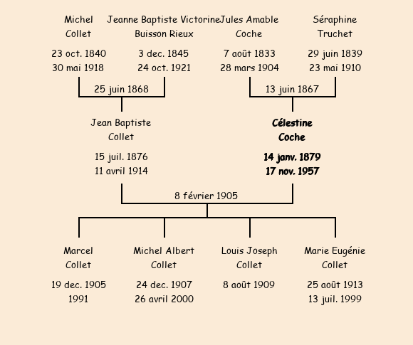 Epouse : Célestine Coche (26 ans née le 14 janvier 1879; domiciliée au Suel), fille de Jules Aimable (décédé au Suel le 28 mars1904) et de Séraphine Truchet |