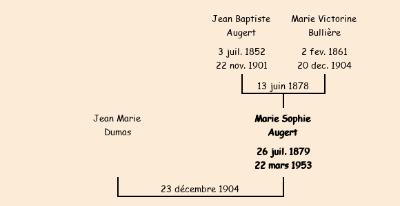 Mentions marginales : Mariée avec Jean Marie Dumas le 23 décembre 1904 à Saint Martin en Coailleux (Loire), décédée le 22 mars 1953 à Saint Chamond (Loire), CA Izieux (Loire) |