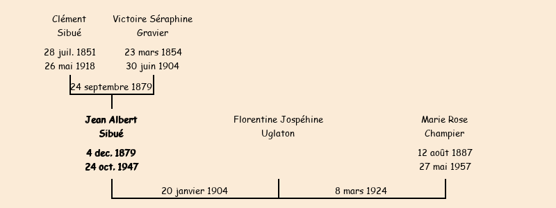 Epoux : Jean Albert Sibué (44 ans, né le 4 décembre1879 à Fontcouverte, domicilié à Saint Jean de Maurienne à la Combe des Moulins, chef mineur, veuf de Florentine Joséphine Uglaton depuis le 12 mai1921), fils de feu Clément et de feue Marie Clémentine Gravier |
