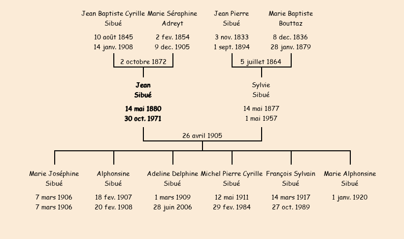 Epouse : Sylvie Sibué (27 ans, née le 14 mai1877 à Fontcouverte), fille de Jean Pierre (décédé à Fontcouverte le 1er septembre1894) et de Marie Baptiste Bouttaz (décédée à Fontcouverte le 28 janvier 1879) |