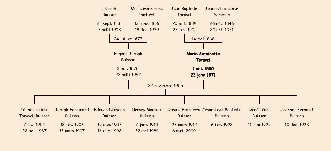 Epoux : Eugène Joseph Buisson (27 ans, né le 3 octobre1878 à Charvin), fils de Joseph (décédé le 7 août1903 à Charvin) et de Geneviève Lambert (50 ans, de Charvin) |