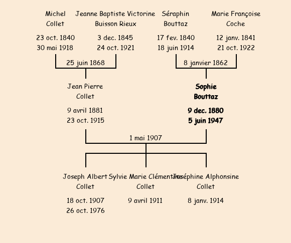 Epouse : Sophie Bouttaz (26 ans, née au Chef Lieu le 9 décembre1880), fille de Séraphin (66 ans) et de Marie Françoise Coche (65 ans) |