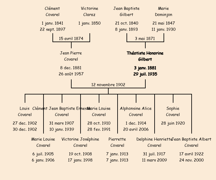 Epouse : Théotiste Honorine Gilbert (21 ans, née le 3 janvier 1881 à la Rochette), fille de Jean Baptiste (décédé le 8 janvier 1893 à La Rochette) et de Marie Dominjon |