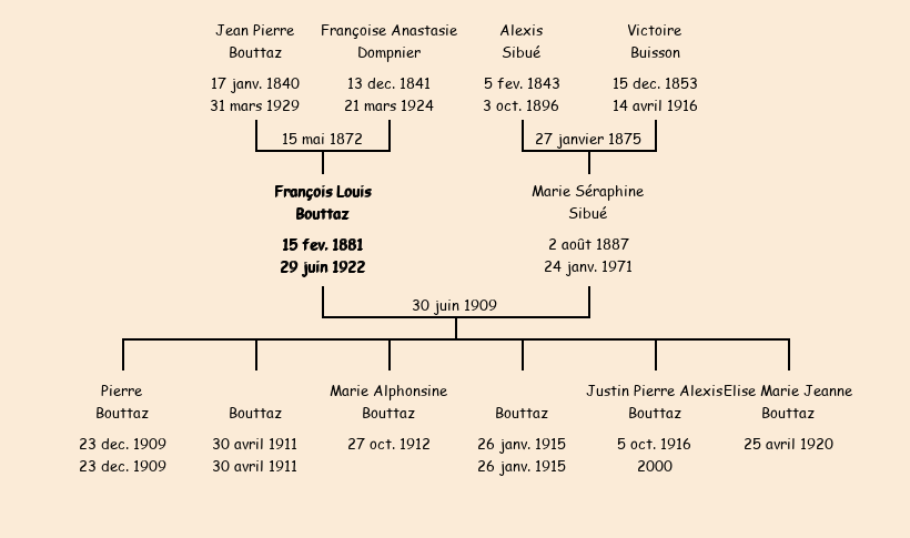 Epoux : François Louis Bouttaz (28 ans, né à Thillerèche le 15 février1881), fils de Jean Pierre (69 ans, de Thillerèche) et de Françoise Anastasie Dompnier (67 ans, de Thillerèche) |