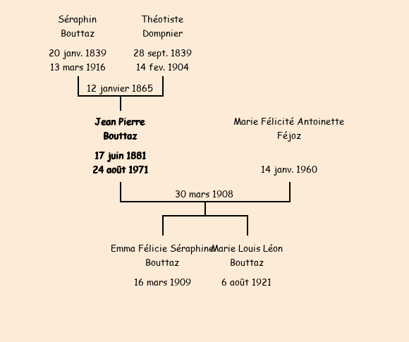 Père : Séraphin Bouttaz, fils de Saturnin (cultivateur, 42 ans, de la Bize) | Parrain : Jean Bouttaz |