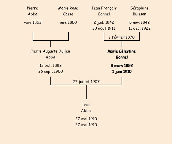 Mariée (25 ans) avec Pierre Auguste Julien Abba (24 ans) le 27 juillet 1907 à Fontcouverte |