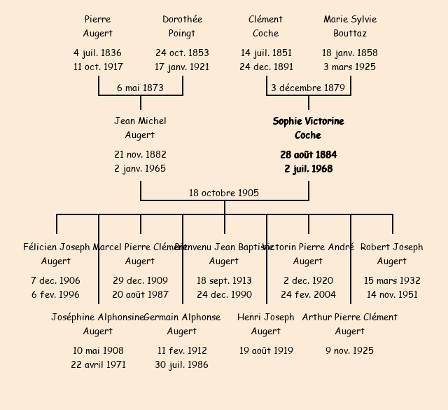 Epouse : Sophie Victorine Coche (21 ans, née le 28 août1884 au Chef Lieu), fille de Clément (décédé au Chef Lieu le 24 décembre1891) et de Sylvie Bouttaz (48 ans) |