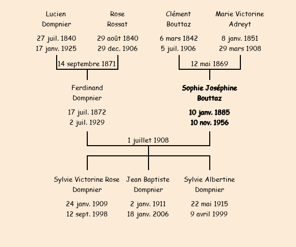 Epouse : Sophie Joséphine Bouttaz (23 ans, née le 10 janvier 1885 à Pierre Pin), fille de Clément (décédé le 5 juillet1906 à Pierre Pin) et de Marie Victorine Adreyt (décédée le 29 mars1908 à Pierre Pin) |
