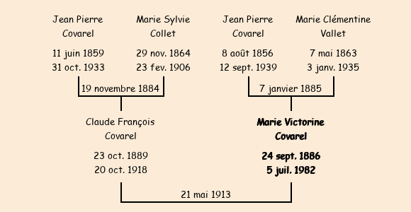 Epouse : Marie Victorine Covarel (née à Fontcouverte le 24 septembre1886, de Vers le Rieux), fille de Jean Pierre (de Vers le Rieux, feu François) et de Marie Clémentine Vallet |