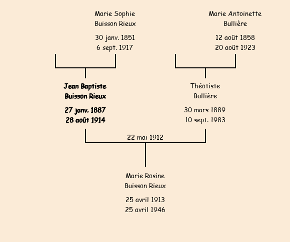 Epoux : Jean Baptiste Buisson Rieux (25 ans, né au Villard le 27 janvier 887), fils de Sophie Buisson Rieux (veuve de Sibué Pierre Antoine, 61 ans, dommiciliée au Villard) |