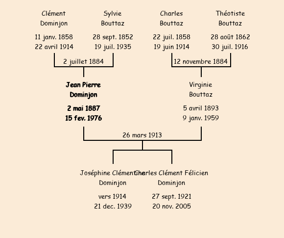 Epoux : Jean Pierre Dominjon (25 ans, né le 2 mai1887 à Pierre Pin et domicilié à Pierre Pin), fils de Clément (55 ans, de Pierre Pin) et de Sylvie Bouttaz (58 ans, de Pierre Pin) |