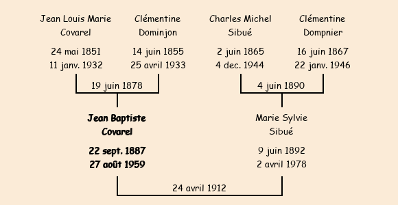 Epoux : Jean Baptiste Covarel (24 ans, né à Fontcouverte le 22 septembre1887), fils de Jean Louis Marie (62 ans, de Vers le Rieux) et de Clémentine Dominjon (55 ans) |
