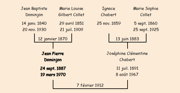 Epoux : Jean Pierre Dominjon (25 ans, né le 24 septembre1887 à la Rochette et domicilié à la Rochette), fils de Jean Baptiste (72 ans, de La Rochette) et de Marie Louise Gilbert Collet (décédé le 21 février1909) |