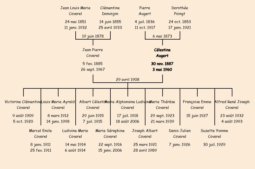 Epouse : Célestine Augert (20 ans, née le 30 novembre1887 au Chef Lieu), fille de Pierre (72 ans, du Chef Lieu) et de Dorothée Poingt (54 ans, du Chef Lieu) |