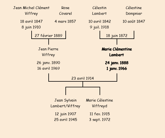 Epoux : Jean Pierre Viffreyd (né à Fontcouverte le 26 janvier 1890, domicilié à la Crousaz), fils de feu Michel Clément et de Rose Covarel (de La Crousaz) |
