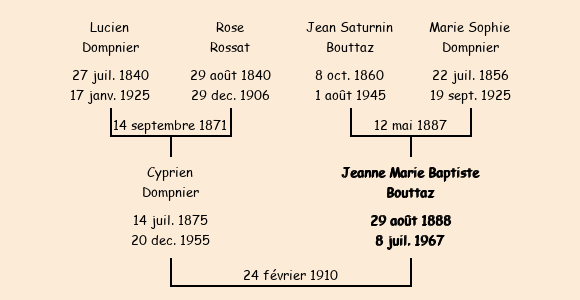 Epouse : Jeanne Marie Baptiste Bouttaz (21 ans, née au Chef Lieu le 29 août1888), fille de Jean Saturnin (50 ans, domicilié au Chef Lieu) et de Marie Sophie Dompmier (53 ans, domiciliée au Chef Lieu) |