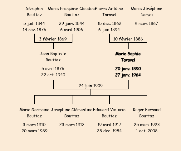 Epoux : Jean Baptiste Bouttaz (33 ans, né et domicilié au ChefLieu, le 5 avril1876), fils de Séraphin (décédé au Chef Lieu le 13 novembre1876) et de Marie Françoise Claudine Bouttaz (décédée au Chef Lieu le 6 avril1906) |