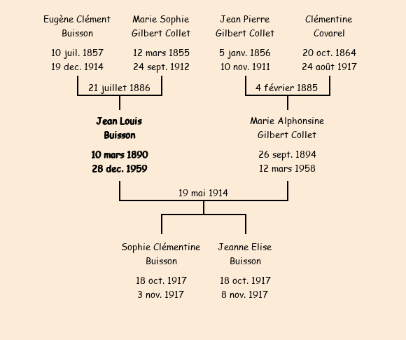 Epoux : Jean Louis Buisson (né à Fontcouverte le 10 mars1890, domicilié à Saint Pancrace), fils de Eugène (domicilié à Saint Pancrace) et de feue Sophie Gilbert Collet |