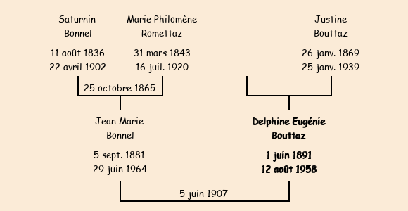 Epouse : Delphine Eugénie Bouttaz (16 ans, née à Pierre Pin le 1er juin1891), fille de Justine Bouttaz (39 ans) |