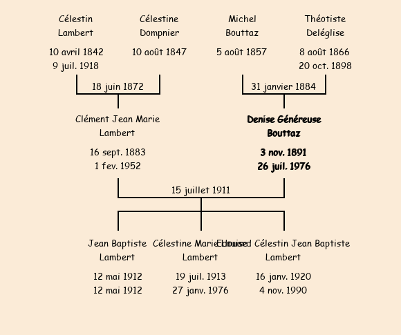 Epouse : Denize Généreuse Bouttaz (20 ans, née à Fontcouverte le 3 novembre1891, de La Bettaz), fille de Michel (54 ans, cantonier) et de Théotiste Deléglise (décédée le 20 octobre1898) |