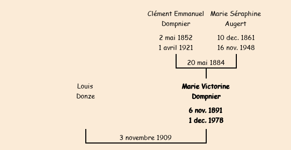 Autres informations : Née à 10 h du matin au Chef Lieu. Mariée le 3 novembre 1909 à Louis Donze de Tourcoing (??) à Notre Dame de Lourdes (Manitoba Canada) |