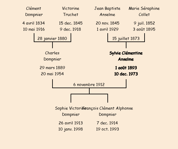 Epouse : Sylvie Clémentine Anselme (19 ans, née le 1er août1893, des Anselmes), fille de Jean Baptiste (67 ans, des Anselmes) et de Marie Séraphine Collet (décédée aux Anselme le 3 août1895) |