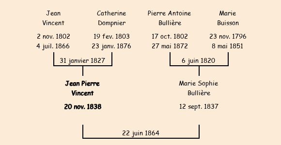 Epouse : Marie Sophie Bullière (27 ans, née le 12 septembre1837, du Chef Lieu, ménagère, a signé), fille de Pierre Antoine (cultivateur, a signé) et de Marie Buisson (décédée le 8 mai1852) |