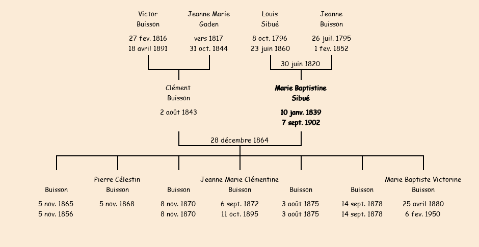 Epouse : Marie Baptiste Sibué (25 an,s née le 10 janvier 1839, de L'Alpettaz, cultivatrice), fille de Louis (décédé le 23 juin1860) et de Jeanne Marie Buisson (décédée le 1er février1852) |