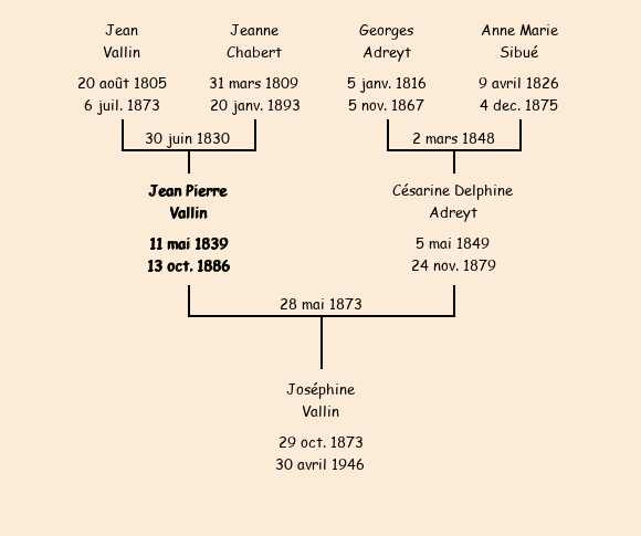 Epoux : Jean Pierre Vallin (34 ans, né le 11 mai1839, cultivateur au Villard, a signé), fils de Jean (cultivateur au Villard, a signé) et de Jeanne Chabert (cultivatrice au Villard, n'a pas su signer) |