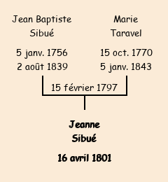 Père : Jean Baptiste Sibué, fils de Jean | Parrain : Jacques Taravel (fils de Jean) |
