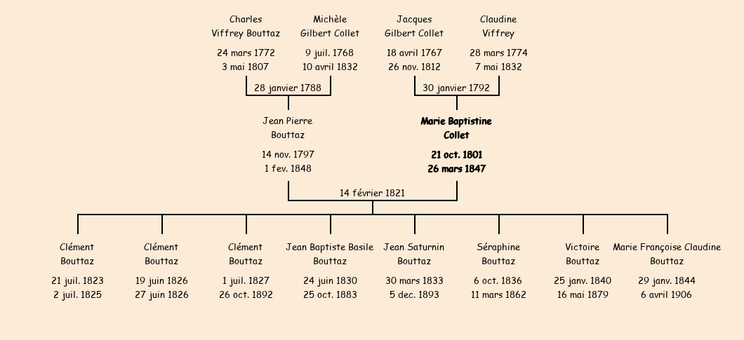 Mariée (19 ans) avec Jean Pierre Bouttaz (23 ans) le 14 février 1821 à Fontcouverte |