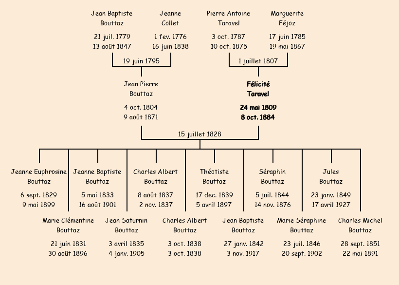 Epouse : Félicité Taravel, fille de Pierre Antoine et de Marguerite Féjoz |