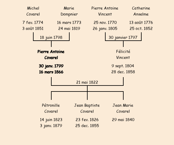 Père : Michel Covarel, fils de Pierre | Parrain : Pierre Antoine Dompnier (grand-père maternel) |