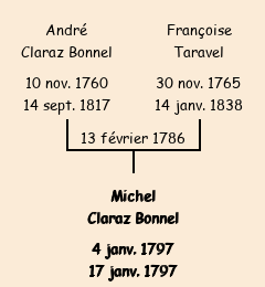 Père : André Claraz Bonnel, fils de Michel | Parrain : Michel Taravel (fils du dit Jean, frère de la marraine) |
