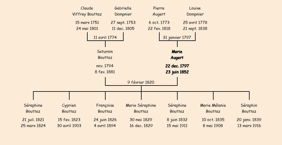 Epoux : Saturnin Bouttaz, fils de feu Claude et de Gabrielle Dompnier |