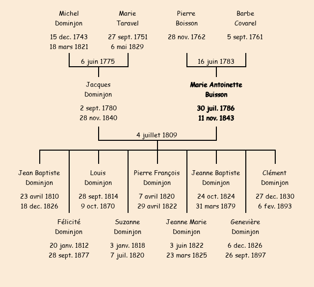 Epouse : Marie Antoinette Buisson, fille de Pierre et de Barbe Covarel |
