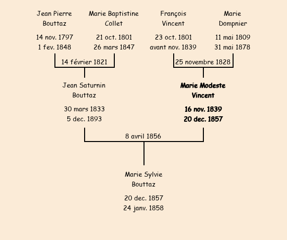 Mariée (16 ans) avec Jean Saturnin Bouttaz (23 ans) le 8 avril 1856 à Fontcouverte ![]() |