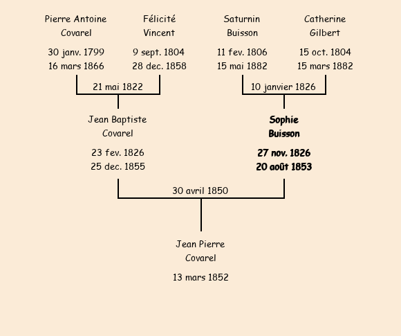 Epoux : Jean Baptiste Covarel (24 ans, a signé), fils de Pierre Antoine (a signé) et de Félicité Vincent |