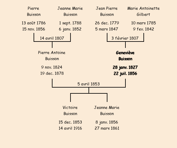 Epouse : Geneviève Buisson (26 ans, a marqué), fille de feu Jean Pierre et de feue Marie Antoinette Gilbert |