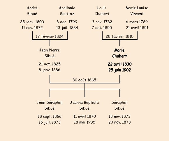 Epoux : Jean Pierre Sibué (36 ans, né le 21 octobre1828, cultivateur à La Bise, veuf de Jeanne Marie Séraphine Dompnier décédée le 10 janvier 1865, a signé), fils de André (cultivateur à la Bize, a signé) et de Apollonie Bouttaz (ménagère, n'a pas su signer) |