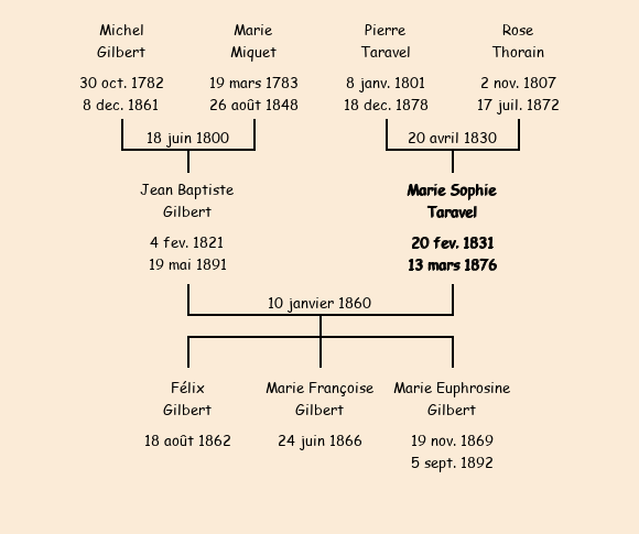 Epouse : Marie Sophie Taravel (28 ans, a marqué), fille de Pierre (a signé) et de Rose Thorain |