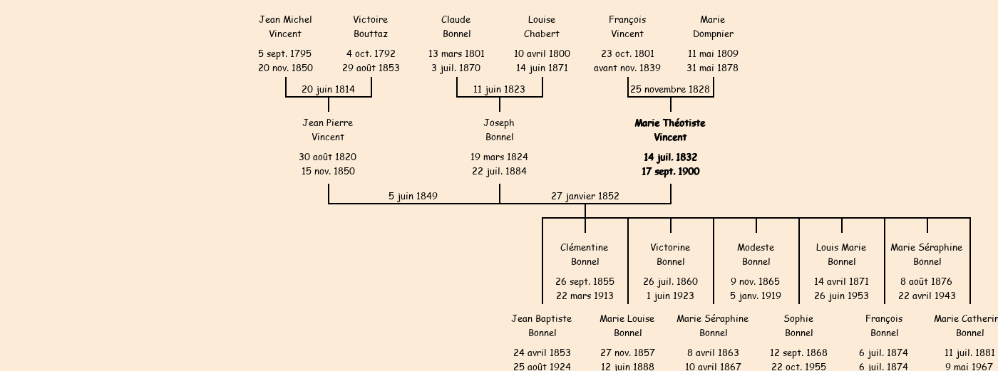 Epouse : Marie Théotiste Vincent (17 ans, a marqué), fille de feu François et de Marie Dompnier (a marqué) |