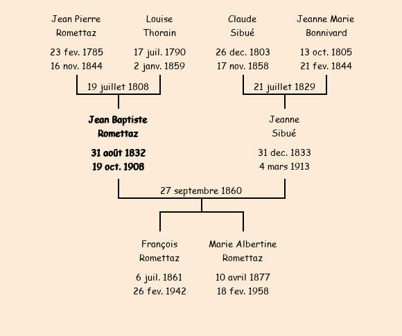 Epoux : Jean Baptiste Romettaz (28 ans, a marqué), fils de feu Jean Pierre et de feue Louise Thorain |