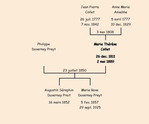Epouse : Marie Thérèse Collet (39 ans, a marqué), fille de feu Jean Pierre et de feue Anne Marie Anselme |