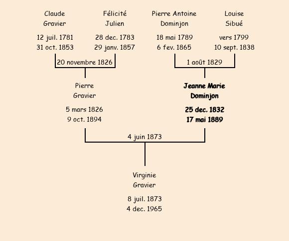 Epouse : Jeanne Marie Dominjon (40 ans, née le 25 décembre1832, cultivatrice, n'a pas su signer), fille de Pierre Antoine (décédé le 6 février1865) et de Louise Sibué (décédée le 10 septembre1838) |