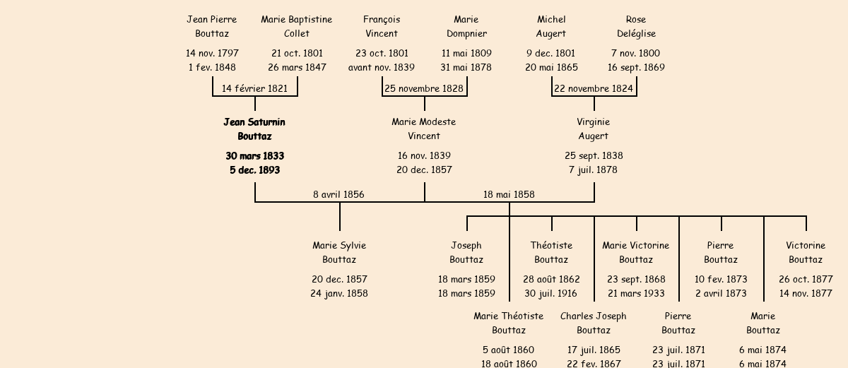 Père : Jean Pierre Bouttaz, fils de Charles | Parrain : Jean Saturnin Bouttaz (fils de Jean Baptiste, notaire) |