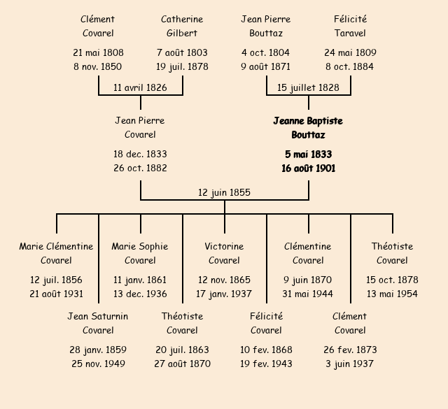 Epouse : Jeanne Baptiste Bouttaz (22 ans, a marqué), fille de Jean Pierre (a signé) et de Félicité Taravel |