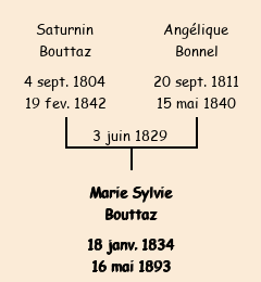 Père : Saturnin Bouttaz, fils de Jean | Parrain : Jean Pierre Bouttaz (oncle de la baptisée) |