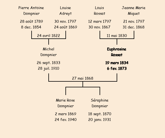 Epouse : Euphrosine Rossat (34 ans, née le 19 mars1834, du Chef Lieu, cultivatrice), fille de Louis (décédé le 30 novembre1867) et de Jeanne Marie Miquet (ménagère au Chef Lieu, n'a pas su signer) |